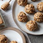 • Line a small baking sheet with parchment paper and spread a little coconut oil on your hands to help handle the sticky dough. Spoon roughly 2 tablespoons of the mixture into well-oiled hands, form into a ball and place on prepared pan. Repeat until all balls are formed.