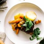 Vietnamese-style braised beef short ribs with onions, garlic, carrots and yellow potatoes, spiced and garnished with five spice seasoning, cilantro, mint and Thai basil.