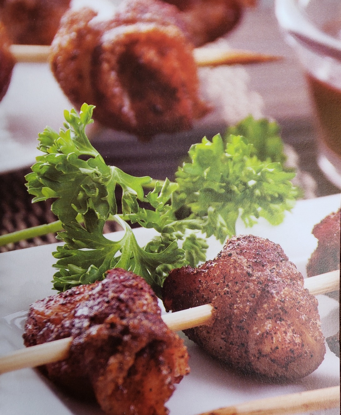 Mix brown sugar and chili powder in a shallow bowl Coat wrapped chicken pieces in brown sugar mixture and arrange skewers on prepared rack. Bake 30 to 35 minutes or until bacon is crisp. Makes about 45 appetizers
