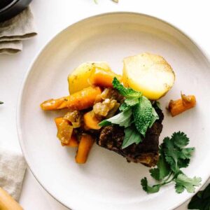 Cook 2 1/2 to 3 hours, until the beef is fork-tender. 1 to 1/2 hours into cooking, add potatoes, if desired.