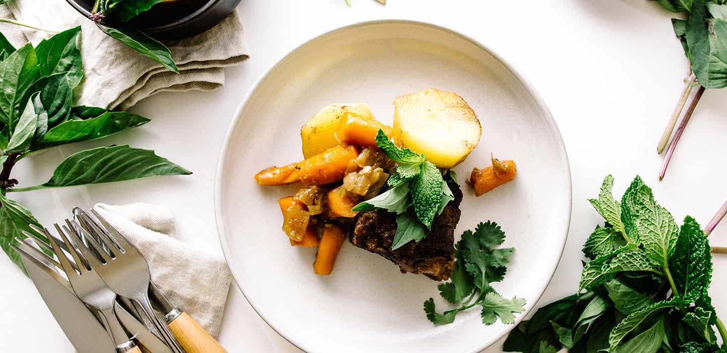Strain liquid and skim off fat. Into a saucepan over medium-high heat, pour liquid to reduce slightly. Pour over the ribs and garnish with cilantro, mint and Thai basil. Serve warm.