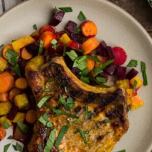 Honey Turmeric Pork Chops with Roasted Beets and Carrots