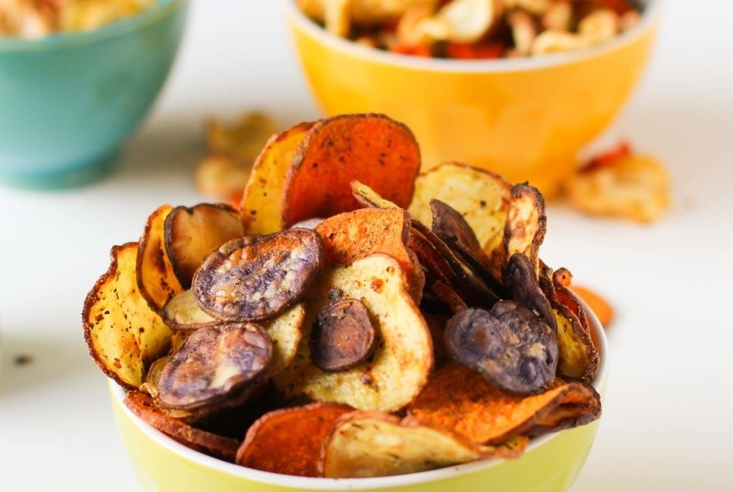 Place potato slices in a mixing bowl and add the oil and Organic Garlic N Herb Seasoning. Use your hands to toss the chips and evenly coat them with oil and seasoning.