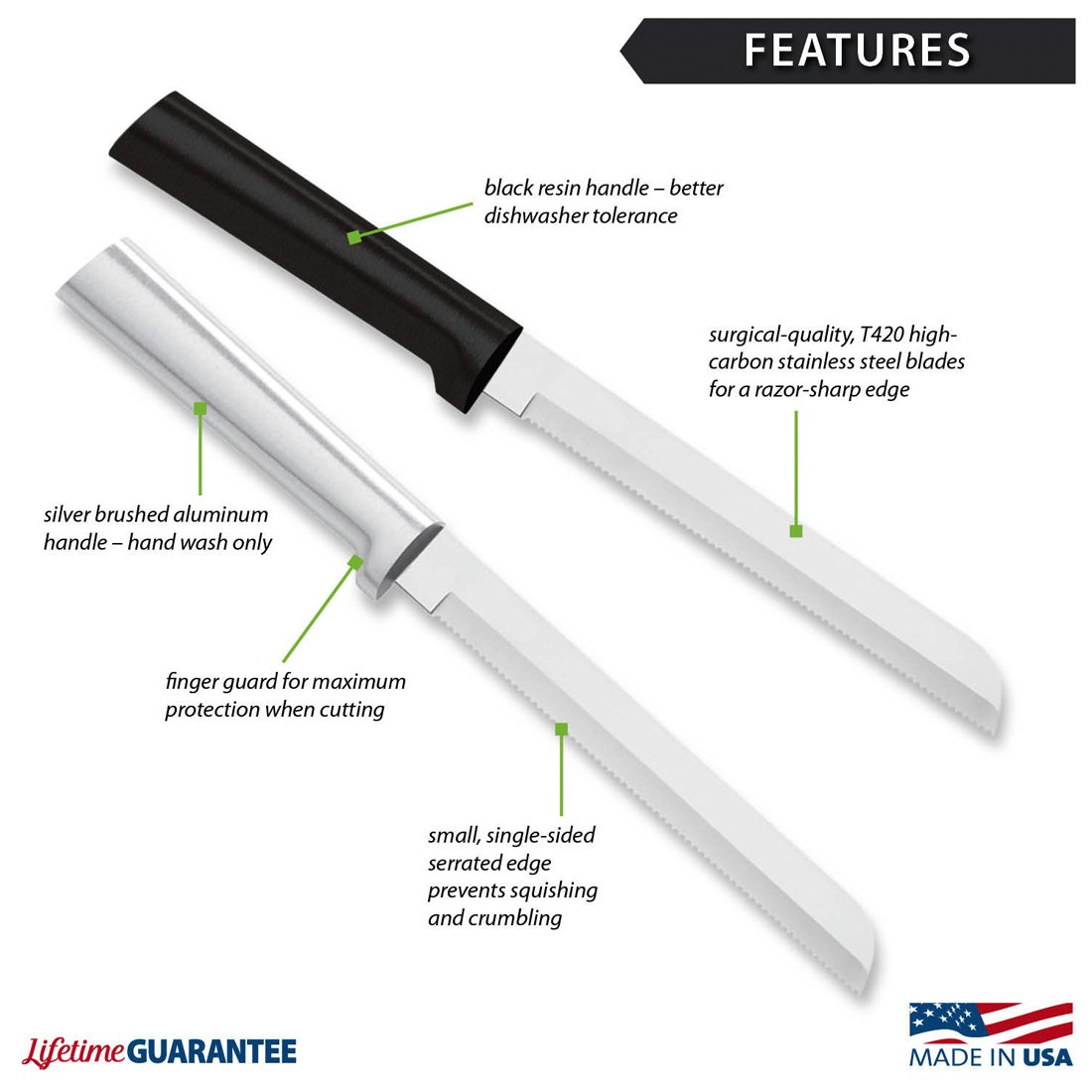 Made from surgical-quality, T420 high-carbon stainless steel, the blade on the 6″ Bread Knife has small, sharp, single-sided serrations. Like all Rada knives, our 6″ Bread Knife is manufactured in the heart of USA, in Waverly, Iowa.