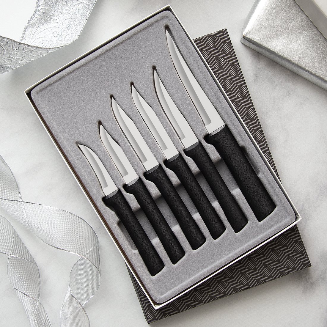 All gift sets are packaged in attractive gift boxes that make wrapping unnecessary—simply add a bow. These uniquely designed boxes have form-fitting thermal inserts to keep the knives in place, making them safe for gift giving as well as storage.