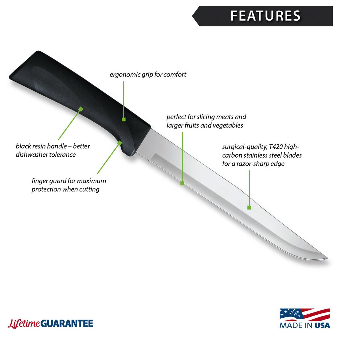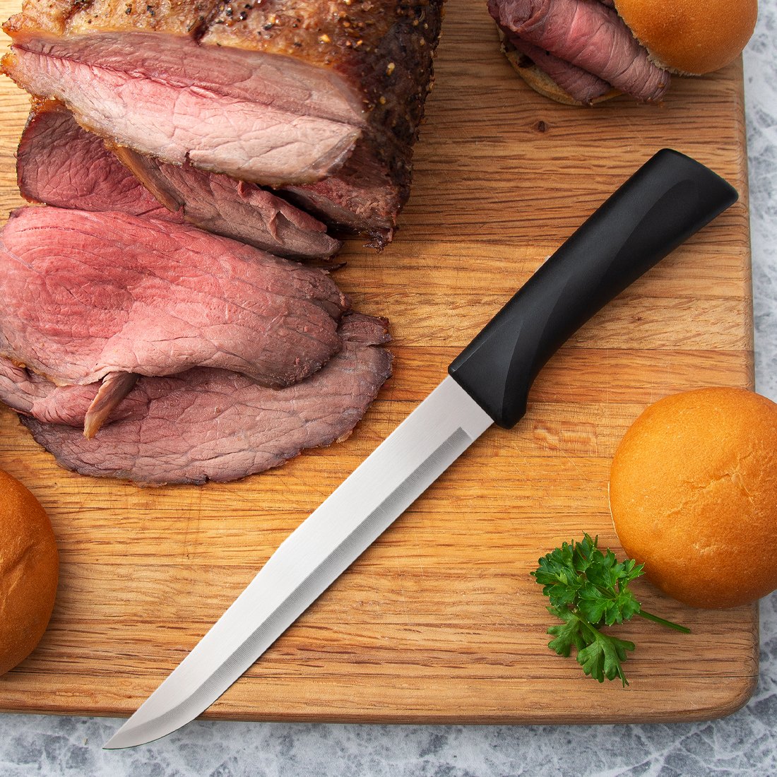 The razor-sharp edge of Rada’s Anthem Slicer (7″ blade / 11⁵/8\” overall) will easily slice through whole pork loin, turkey, prime rib, or roast. Cut up ingredients for stew, slice a head a cabbage for the grill, or easily cut through any type of melon. This knife, at a fraction of the price of others on the market, is ideal for just about any kitchen task.