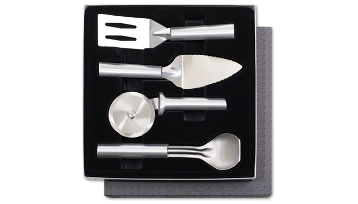 The 4-piece Ultimate Utensil Gift Set includes an Ice Cream Scoop, Pizza Cutter, Serrated Pie Server, and Spatula.